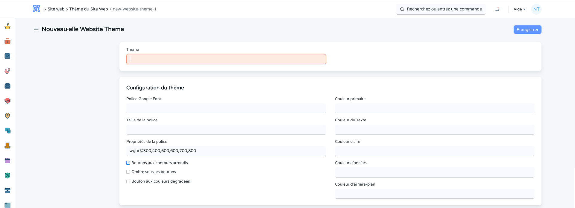 La section Theme Configuration est là pour amorcer un thème de base. Ici, vous pouvez choisir votre palette de couleurs, la police et les styles de boutons.