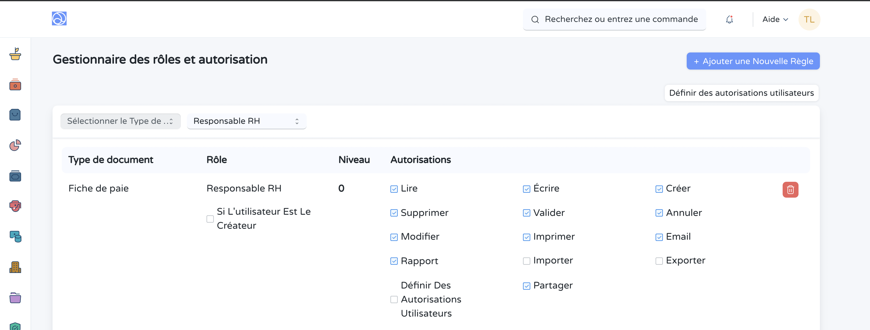 Le gestionnaire d'autorisations de rôle vous permet de définir quels rôles peuvent accéder à quels documents et avec quelles autorisations (lecture, écriture, soumission, etc.).