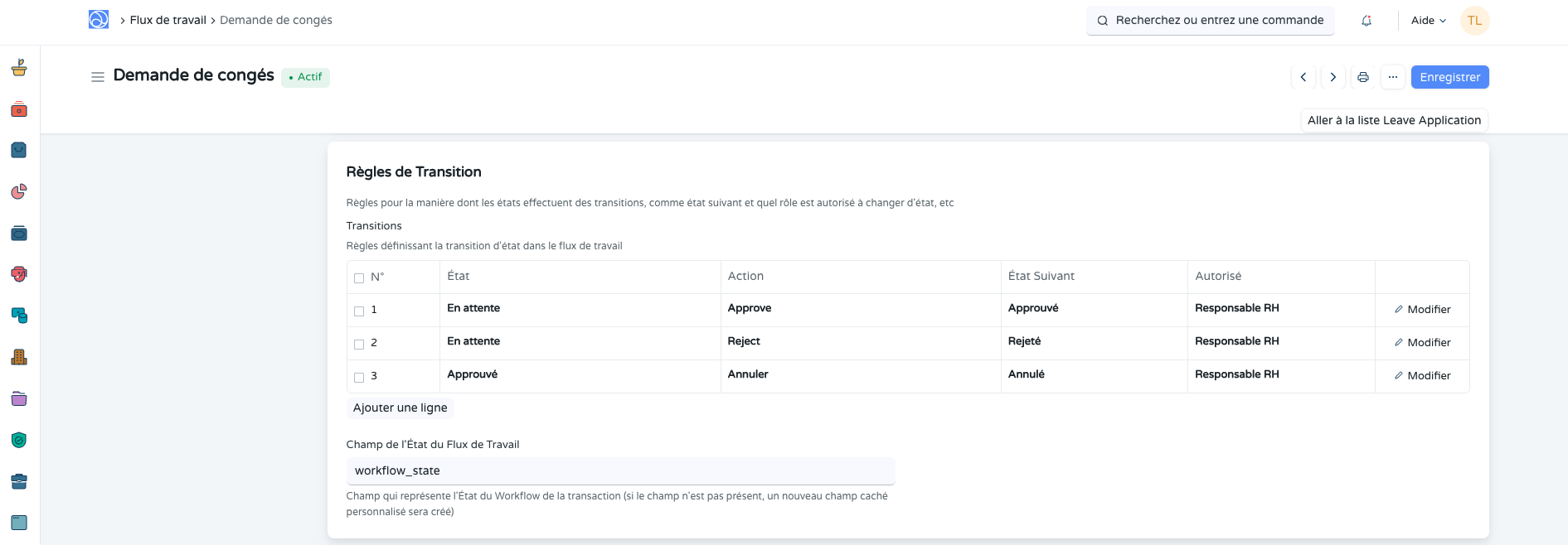 Indiquez les actions qu'un approbateur peut entreprendre sur la demande de congé. L'état suivant est l'état dans lequel se trouve le type de document lorsque l'action est appliquée. Donc, ici, l'état passe de Appliqué à Approuvé par HR lorsque l'action Approuver est exécutée sur celui-ci.