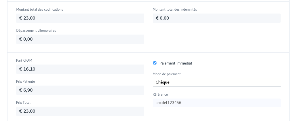 Il ne vous reste plus qu'à entrer le mode de paiement choisi par la patiente et la référence (numéro du chèque par exemple).